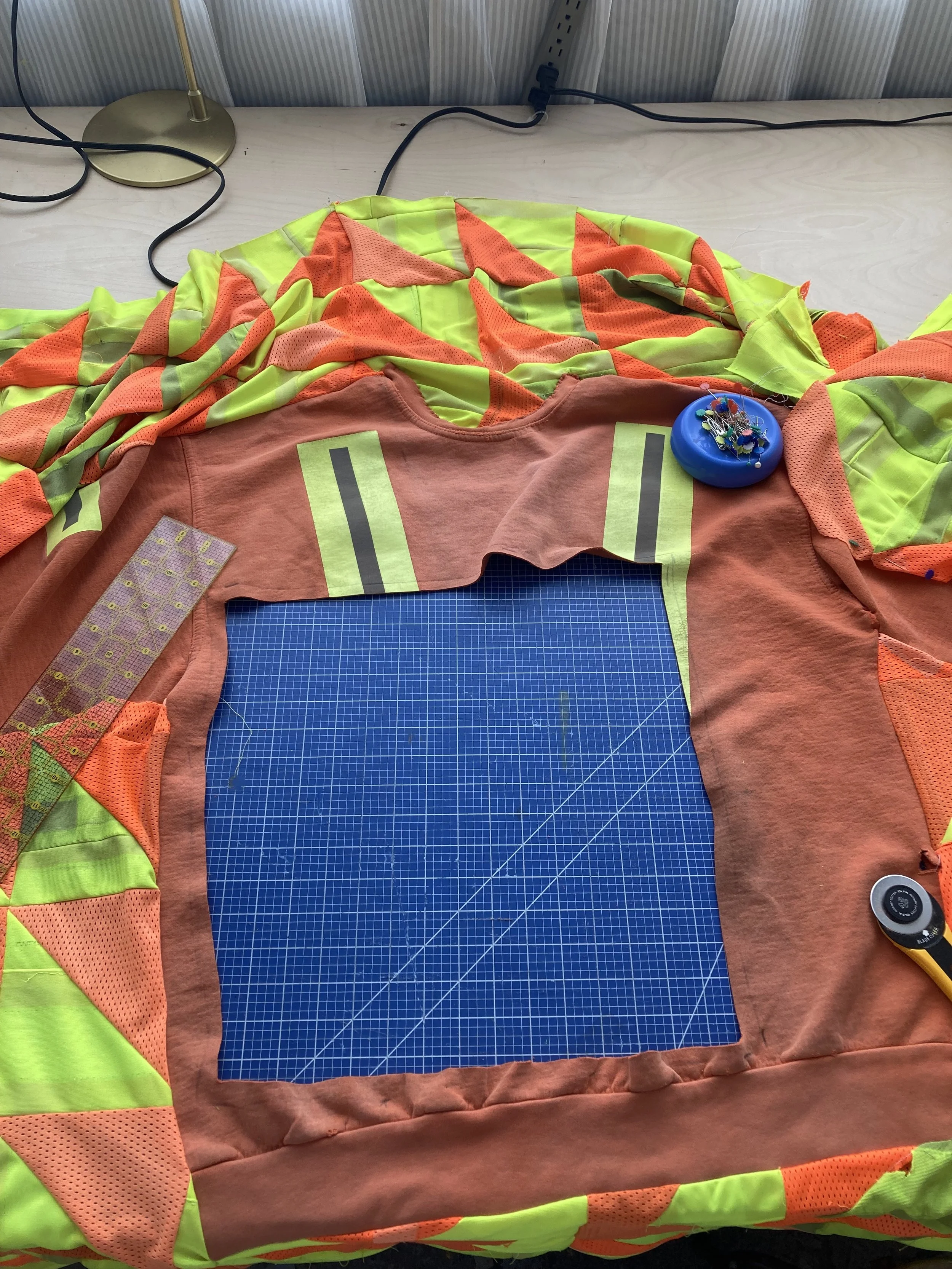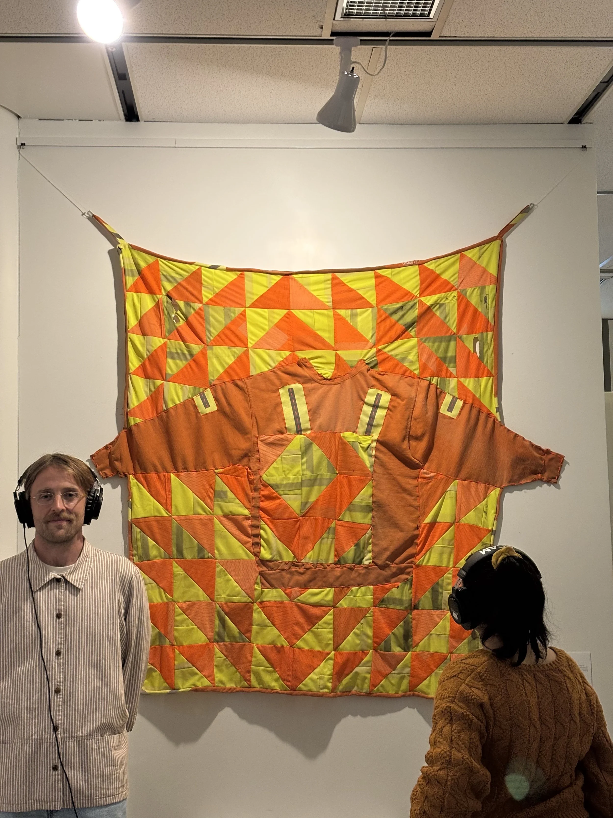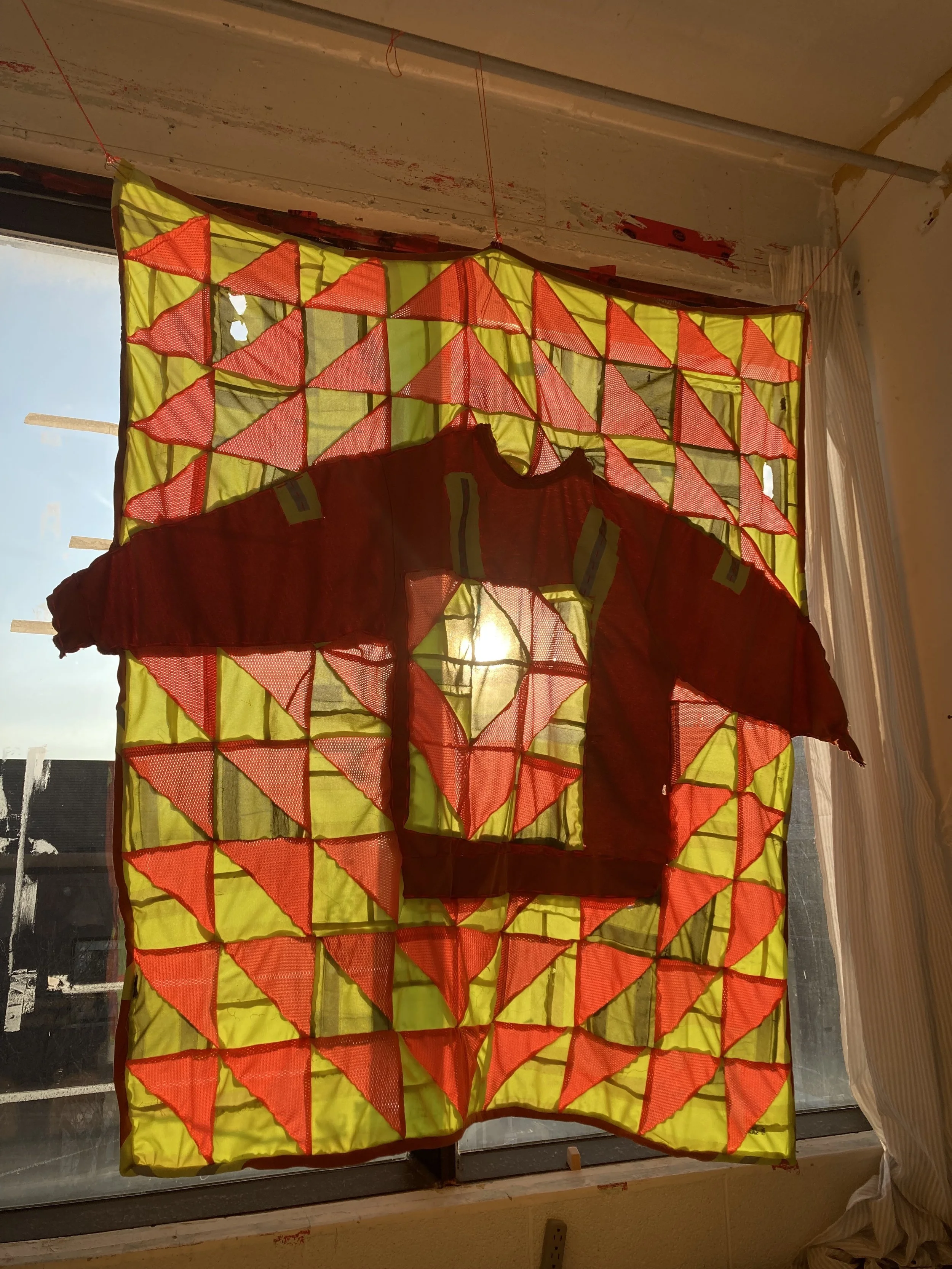 Safety is a Feeling, 2024, I repurposed old safety vests and used patterned quilting designs as a way to honour the bodies and minds of forestry workers. The vests used here were donated to me by workers, who I interviewed for my project, ‘The Mill’. Quilting with workers’ clothing has allowed me to embody the conversations we had and to repurpose the materials from the industry into a function beyond profit or business logics.