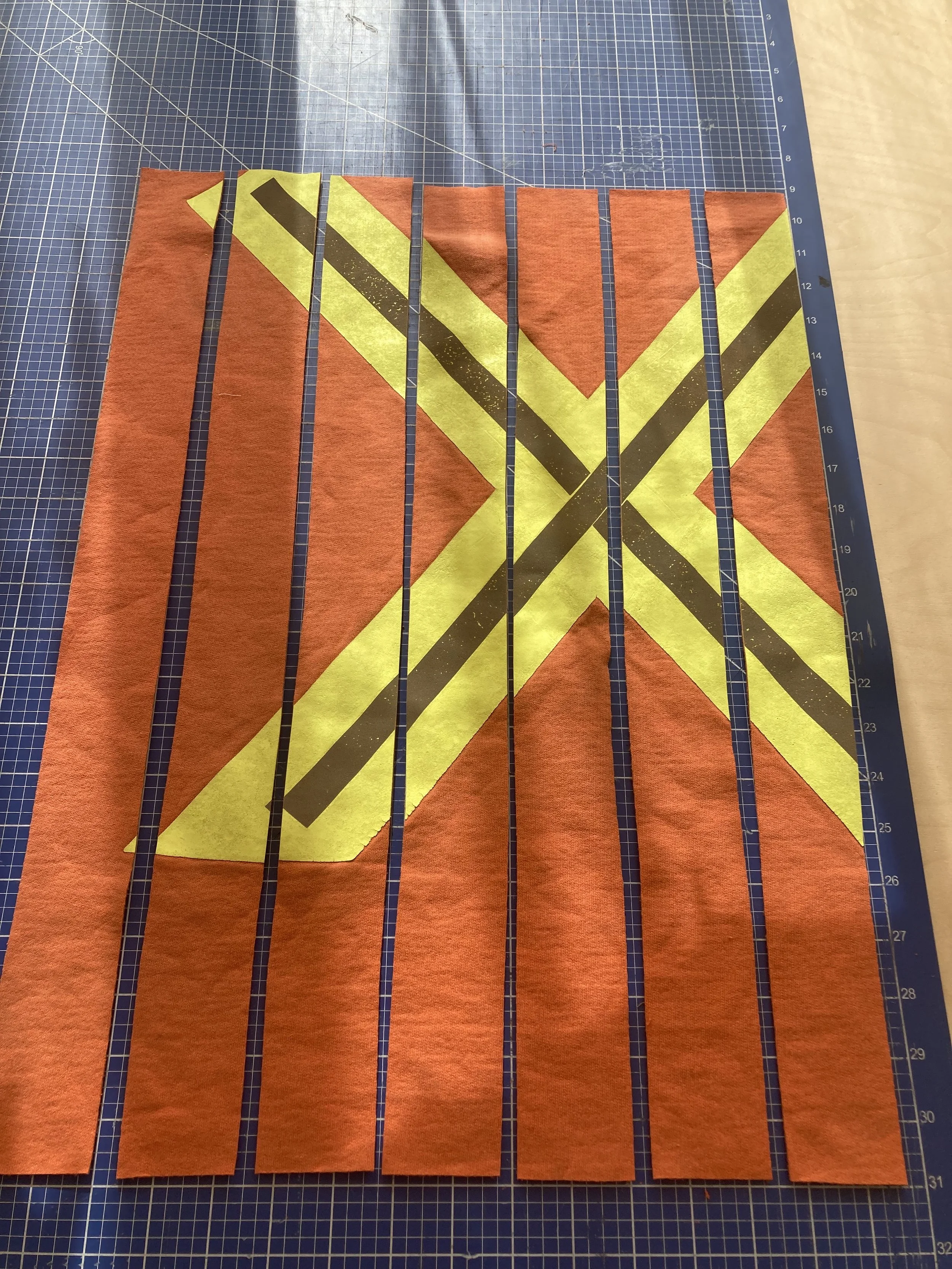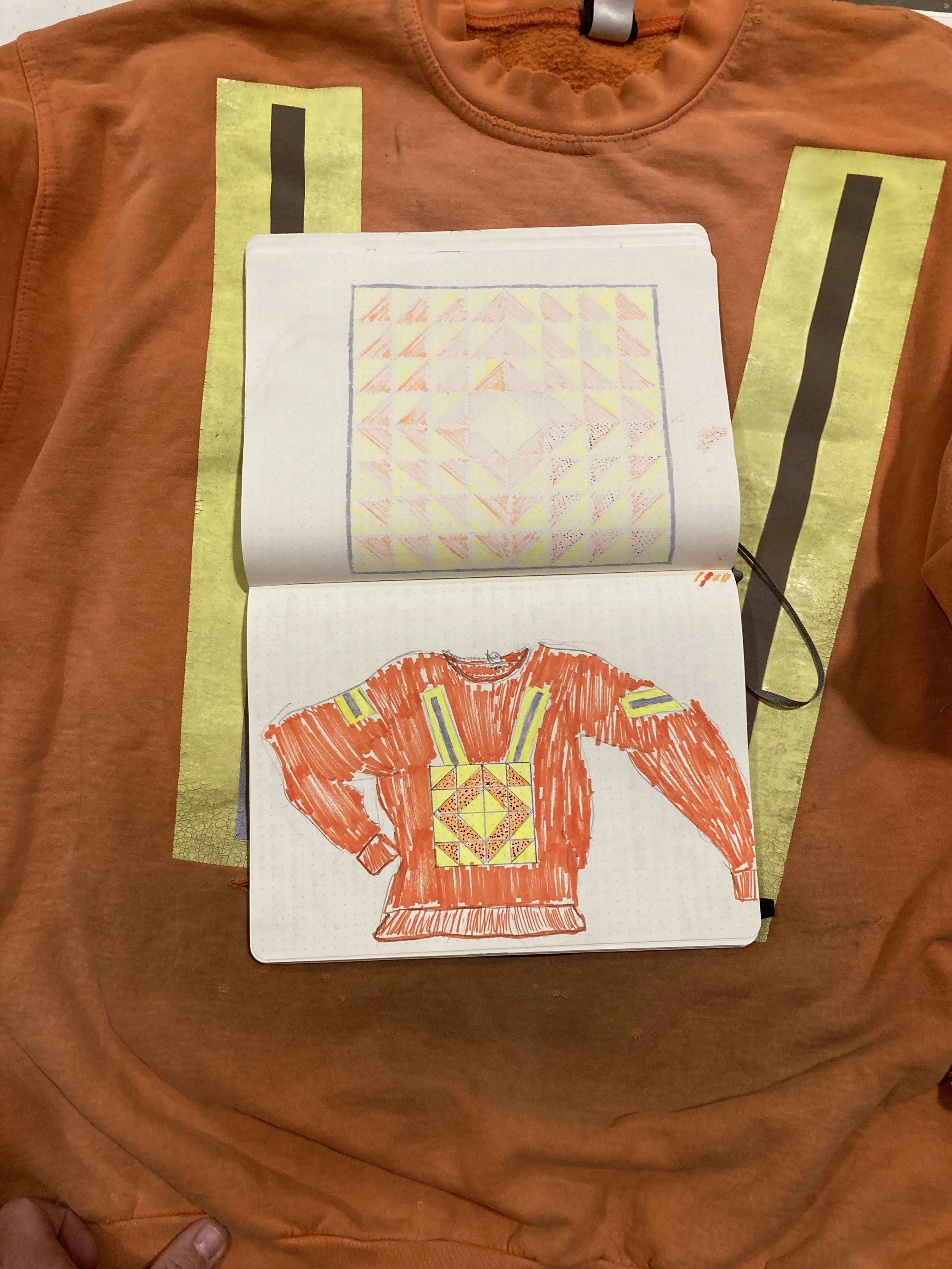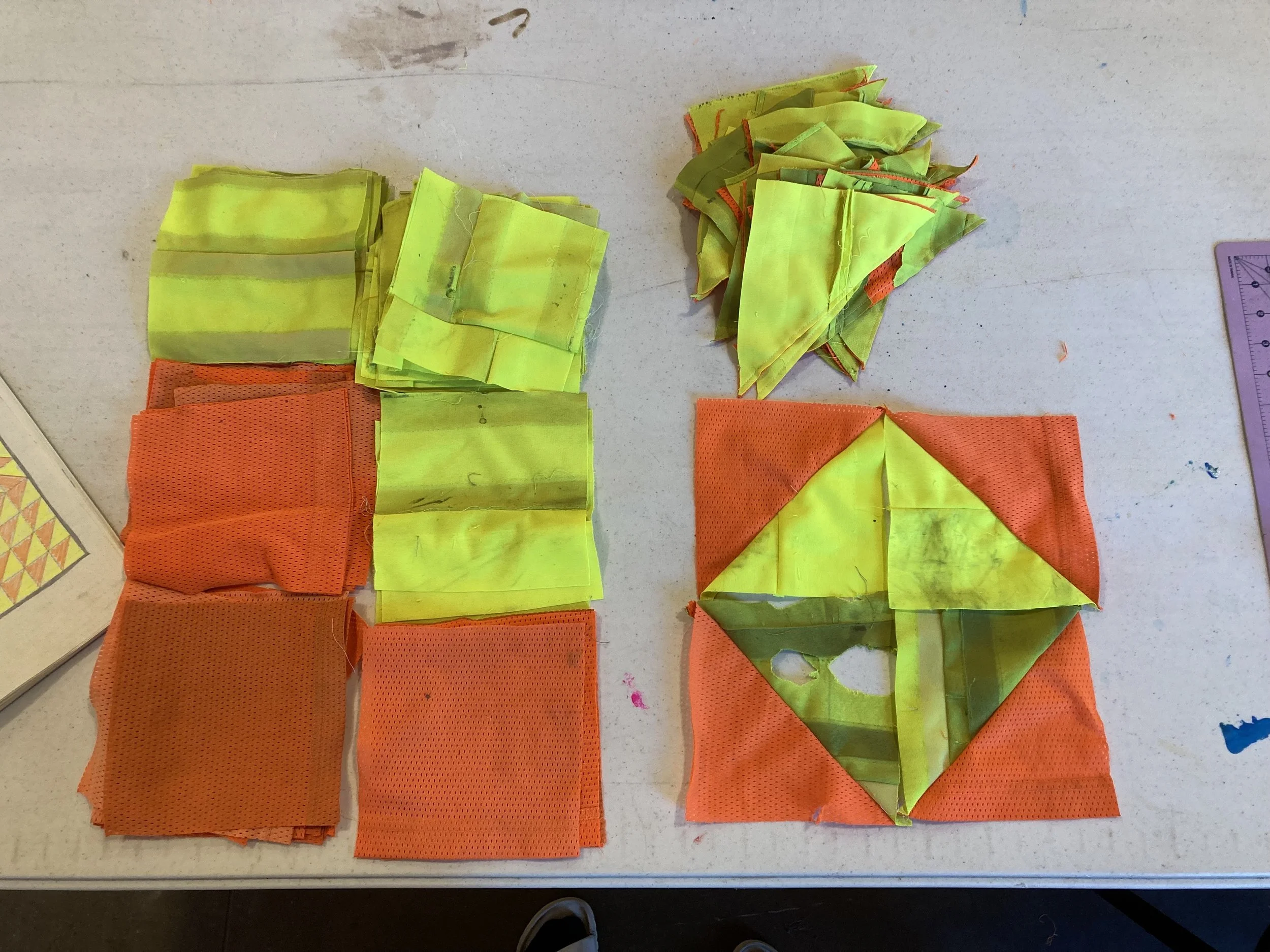Safety is a Feeling, 2024, I repurposed old safety vests and used patterned quilting designs as a way to honour the bodies and minds of forestry workers. The vests used here were donated to me by workers, who I interviewed for my project, ‘The Mill’. Quilting with workers’ clothing has allowed me to embody the conversations we had and to repurpose the materials from the industry into a function beyond profit or business logics.